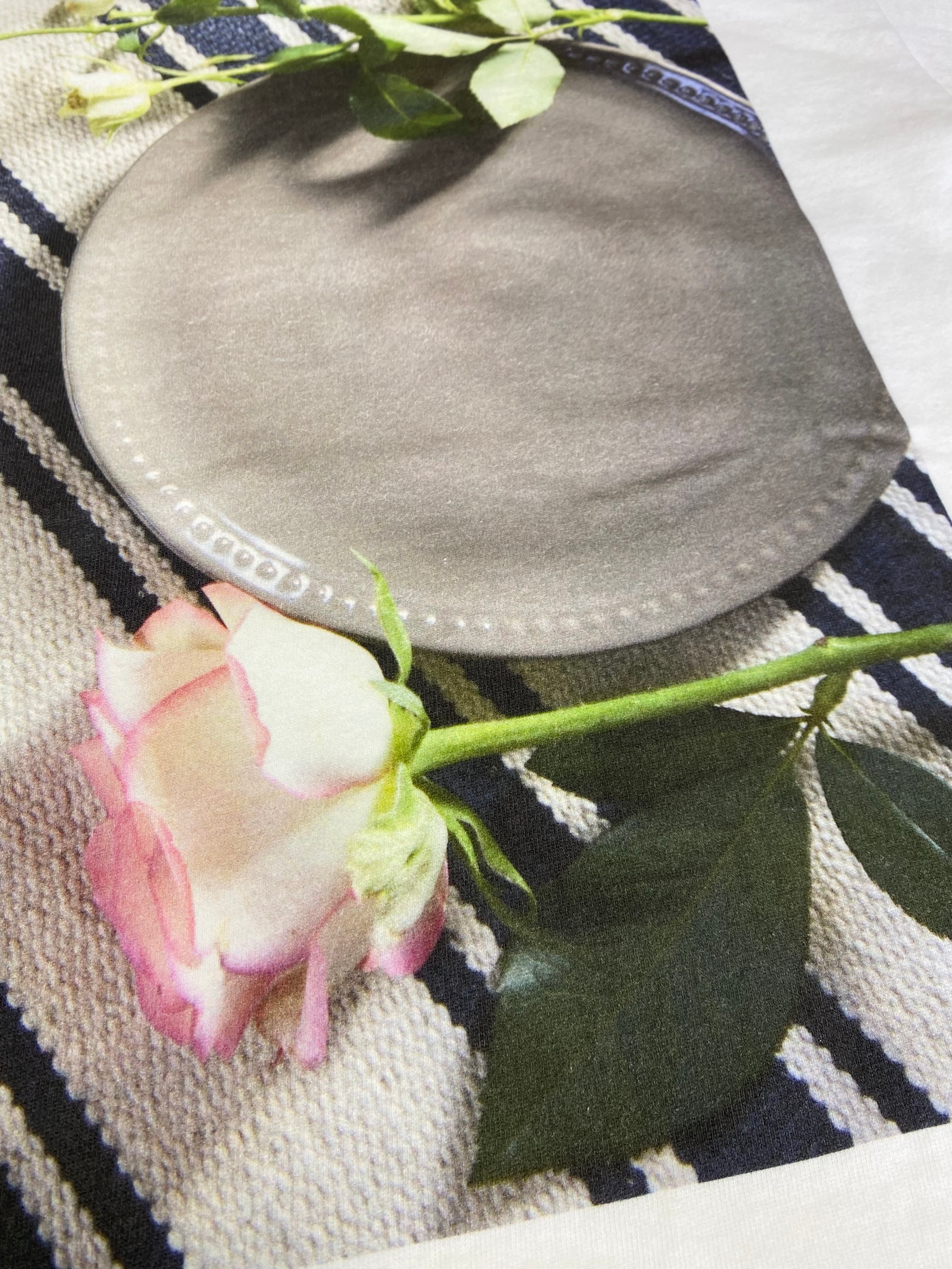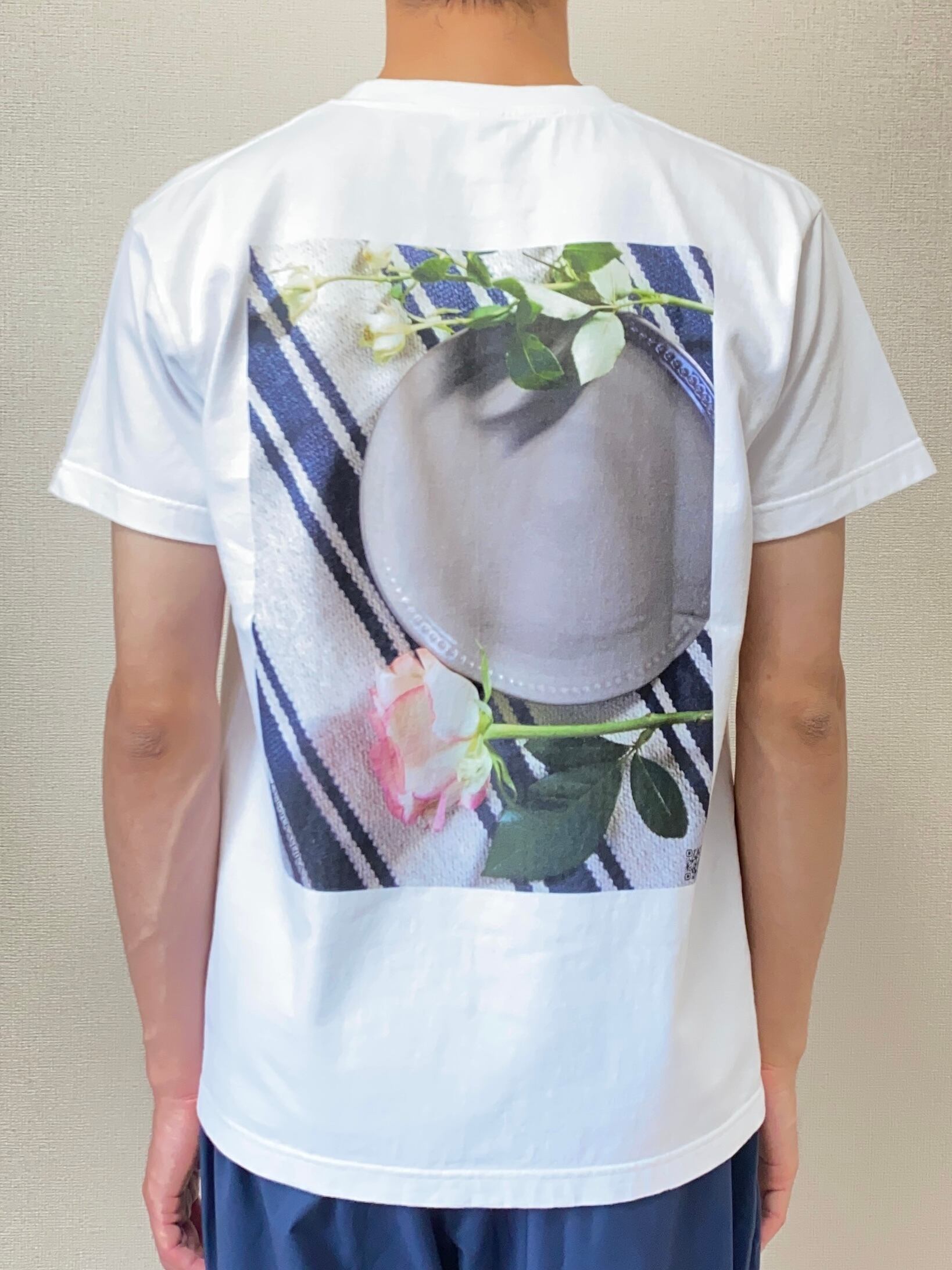 『ROSE』がバックにプリントされたTシャツ。