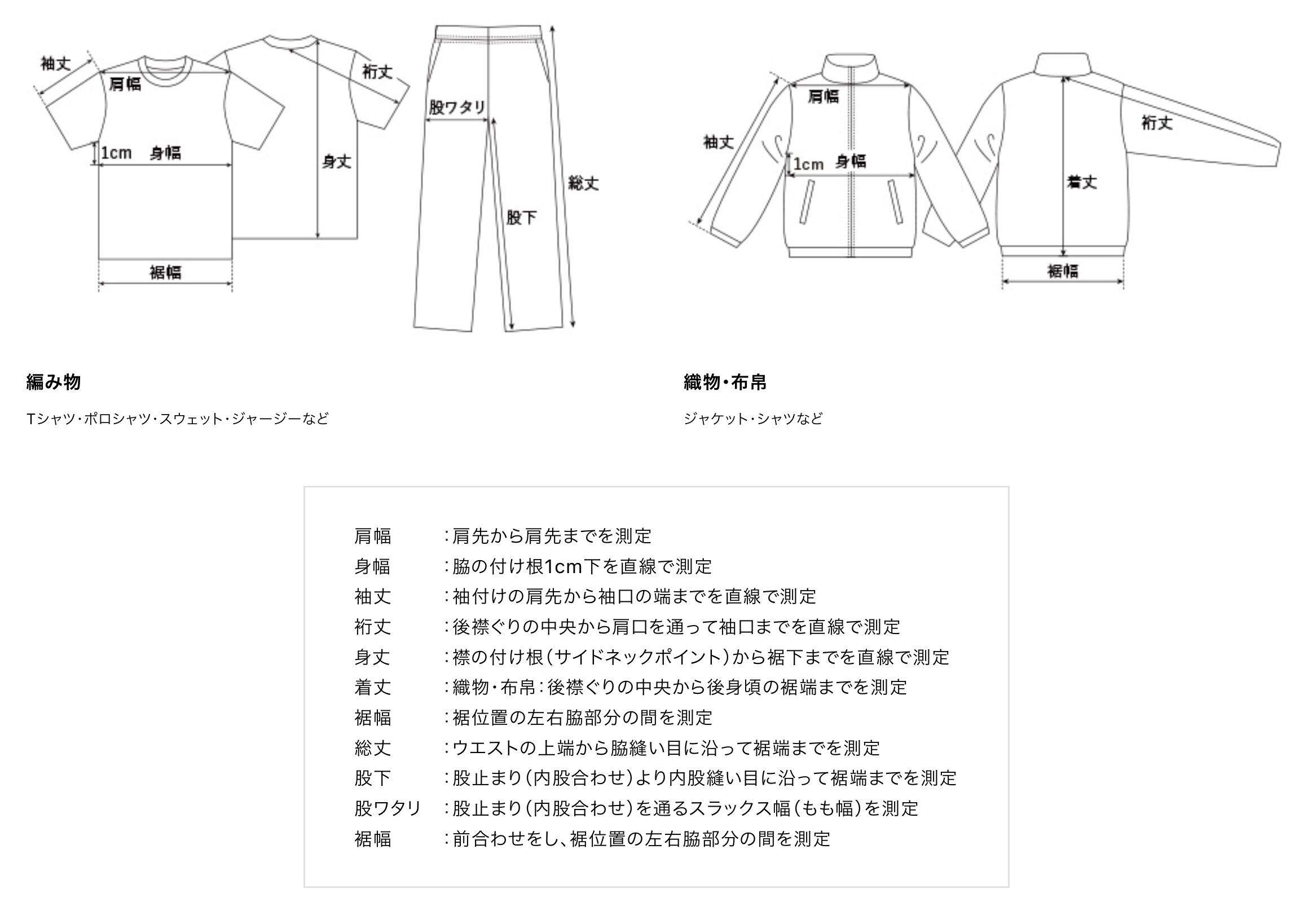 独自の採寸方法によるサイズを商品ページの「サイズ・詳細」に掲載しています。